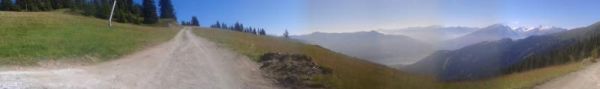 Hoch oben in windiger Höhe werben Paragleiter Passagiere für Tandemsprünge an. Wir erfüllen unserem 14-jährigen Sohn einen lang gehegten Herzenswunsch und schicken ihn im Flugtandem mit Rudi (von einer staatlich geprüften Gleitschirmflugschule) den Berg hinab. Derweil bleiben wir übrigen drei bodenständig und machen uns an den Abstieg. Die Wegbeschreibung führt im großen Bogen hinab zur Talstation. Wir kürzen ab, nehmen den als Skiabfahrt ausgeschilderten direkten Weg und sparen dadurch eine dreiviertel Stunde ein. Leider bedenken wir nicht, dass wir das Manöver mit zweitägigem Muskelkater und Blasen an den Zehen büßen müssen.